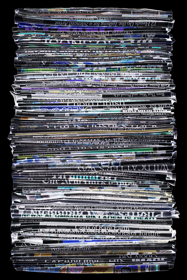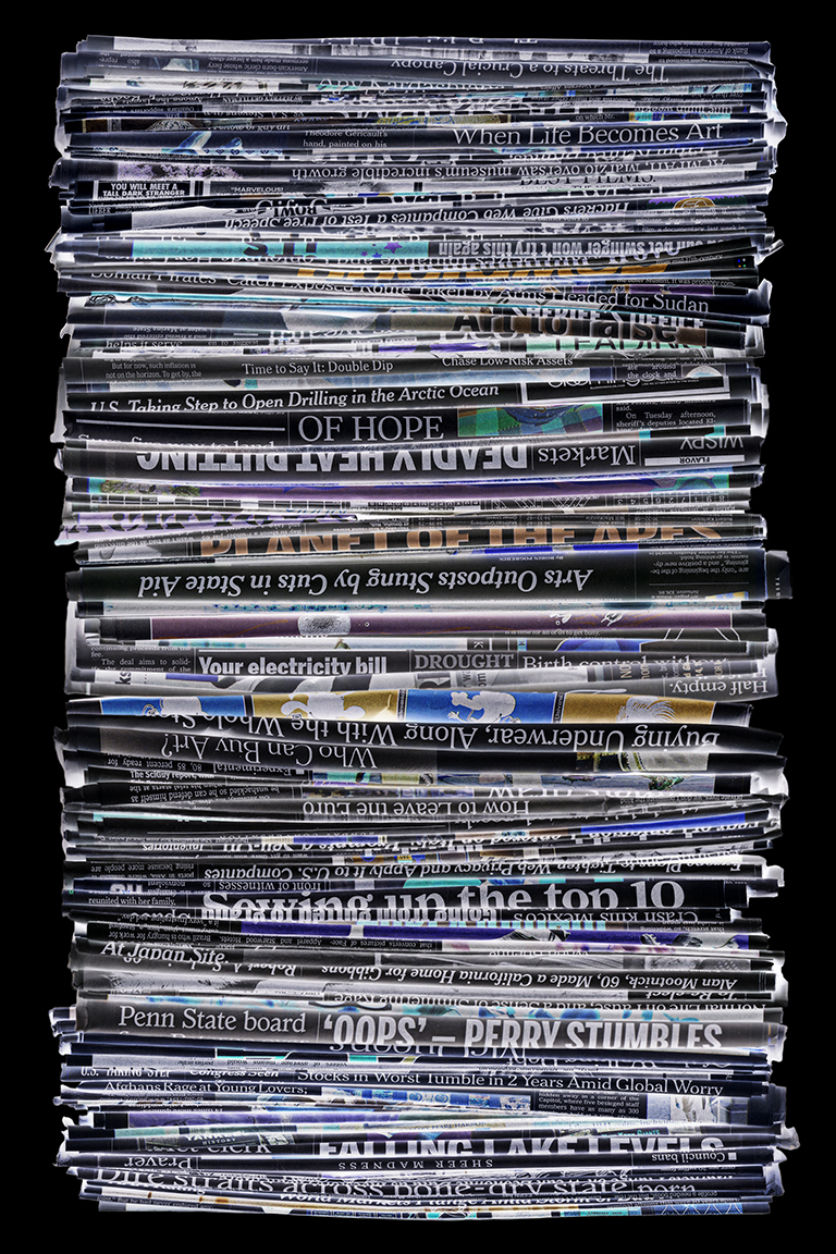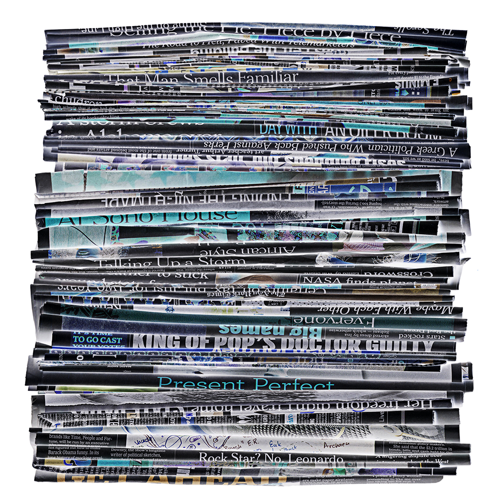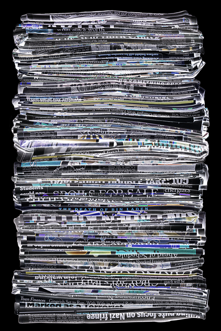 This project could easily be about waste and recycling. It is not. Rather, it is about the masses of information – more specifically, the overload of information in our lives. It wasn’t long ago that we only had to contend with television, magazines, newspapers and mail. Now, on top of those media, we have mobile Internet, electronic books, and the World Wide Web — which contains amounts of data so limitless we could never absorb even a fraction of it all.
